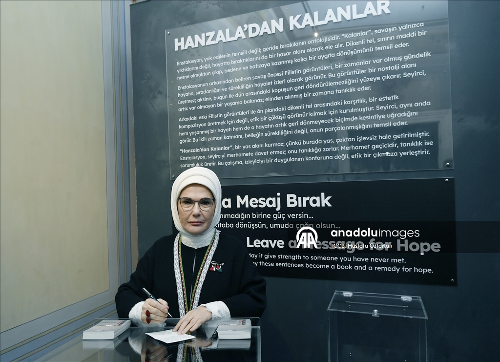 Erdoğan, serginin enstalasyon alanlarından, "Hanzala'dan Kalanlar" Umuda Mesaj Bırak alanında, "Filistin bir gün yeniden barış yurdu olacak ve güvercinler bu müjdeyi tüm çocuklara taşıyacak. O güne kadar, siz her zaman dualarımızda, bizse hep sizin yanınızda olacağız." mesajını deftere yazdı.