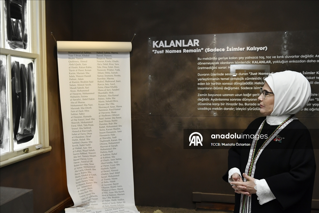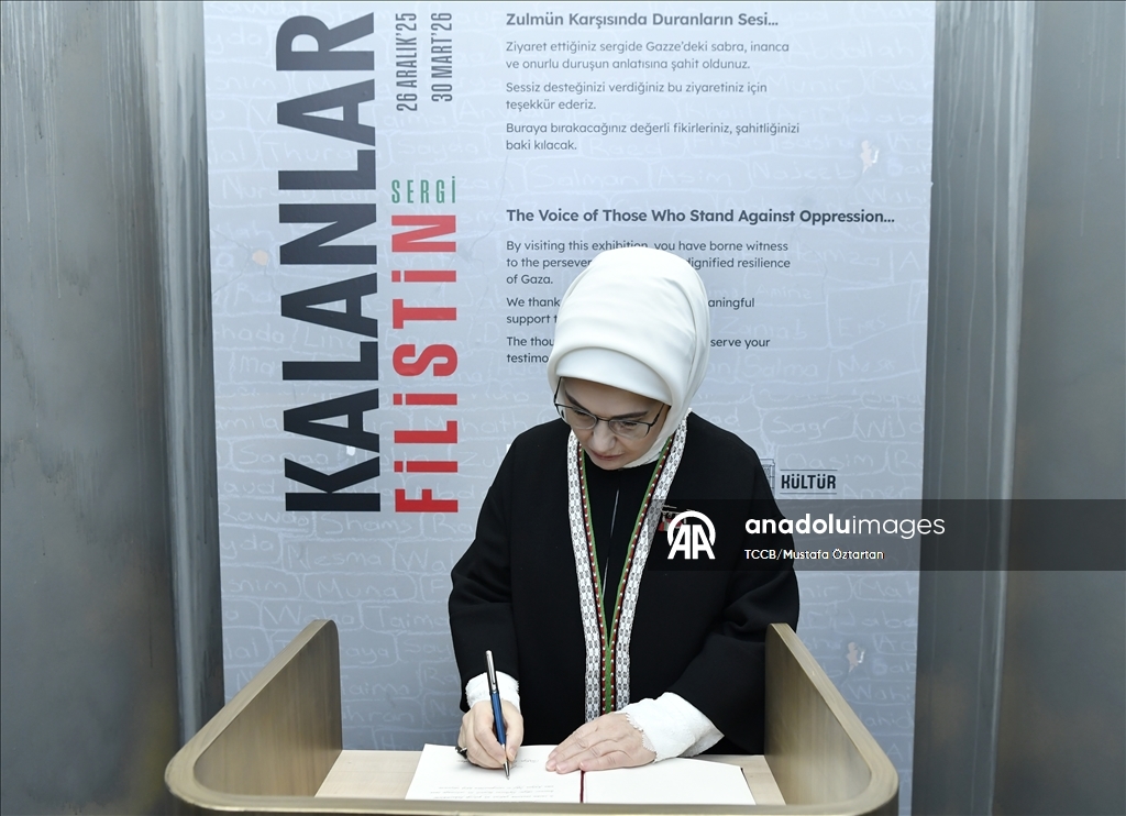 Emine Erdoğan, "Kalanlar" Filistin Sergisi'nin açılışında yaptığı konuşmada, "Filistin'i savunmak, Filistinliler kadar tüm insanlığı, onu ayakta tutan değerleri ve en başta da insan kalma hakkımızı savunmaktır." dedi.