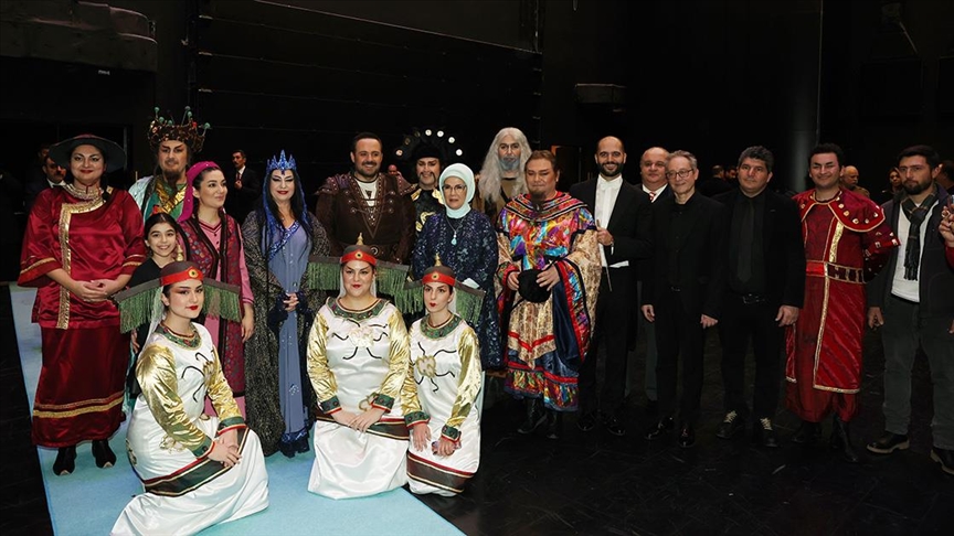 Opera gösterisi sonrası sahnenin arka kısmına geçen Emine Erdoğan, sanatçıları kutladı. Sanatçılarla hatıra fotoğrafı çektiren Erdoğan, Murat Karahan ile sohbet etti.