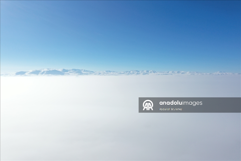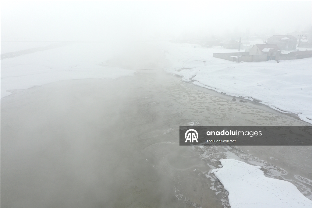 Kenti kaplayan sis ve Murat Nehri'nde akan buz kütleleri dronla görüntülendi.