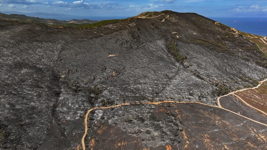 Orman Bölge Müdürlüğü ve İzmir İtfaiyesi ekiplerinin soğutma çalışmalarını sürdürdüğü yangında yaklaşık 340 hektar arazinin hasar gördüğü belirlendi.
