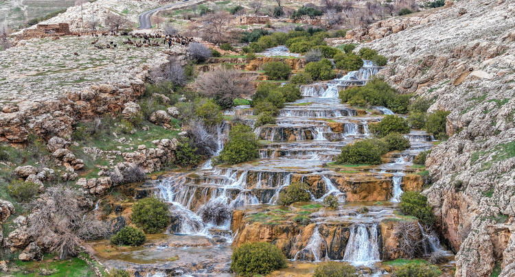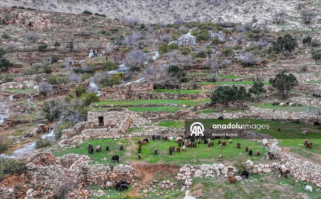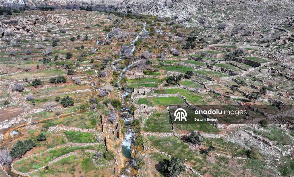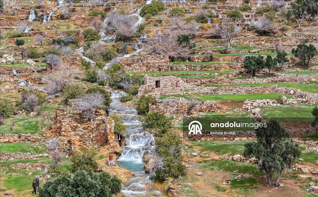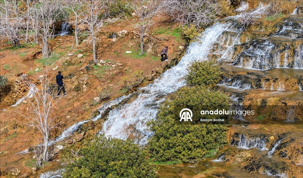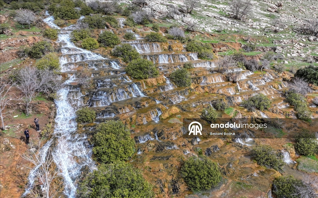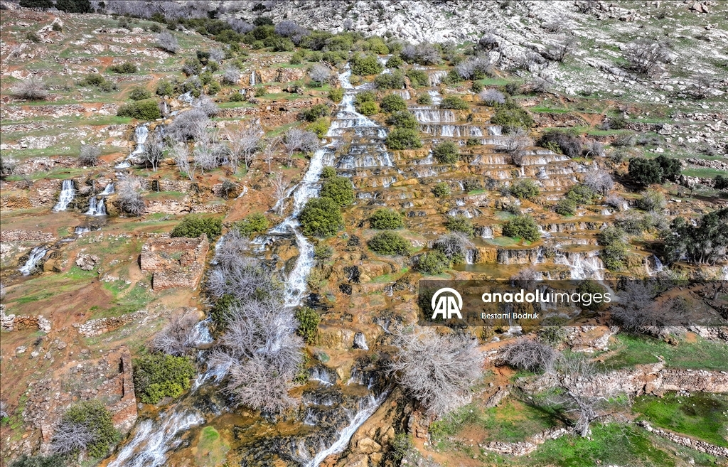 Mardin'in Kızıltepe ilçesinde geçmiş yıllarda yağış azlığı ve kuraklık nedeniyle kuruyan, bu yıl ise yağışlarla yeniden canlanan yörede "Emrud travertenleri" olarak bilinen su kaynağı da çağlayanlar ve şelaleler oluşturarak akıyor.