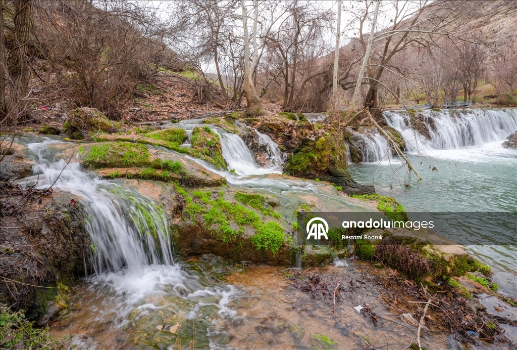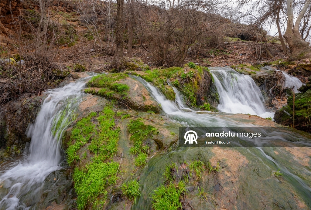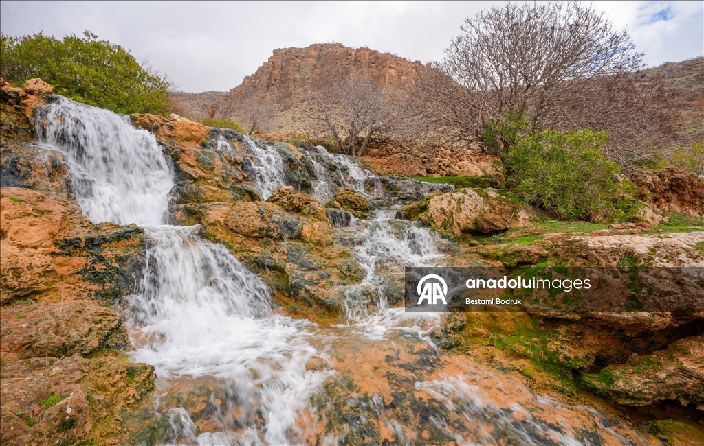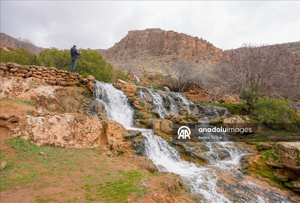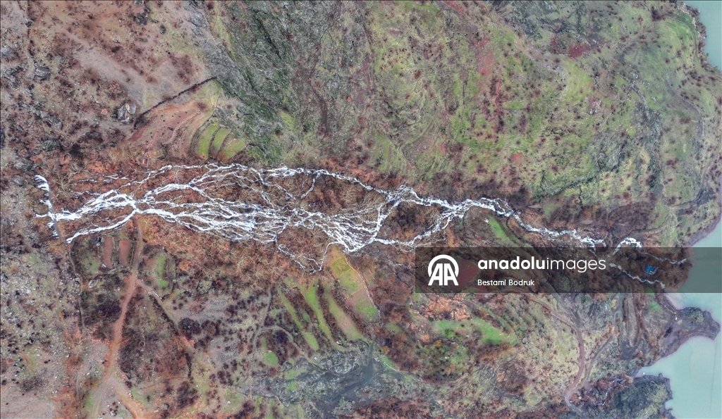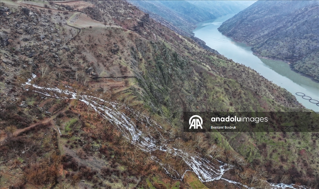 Diyarbakır'ın Çüngüş ilçesinde Maden Dağlarının sarp yamaçlarından çıkan yeni pınarlar şelaleye dönüşerek Atatürk Baraj Gölü'ne dökülüyor.