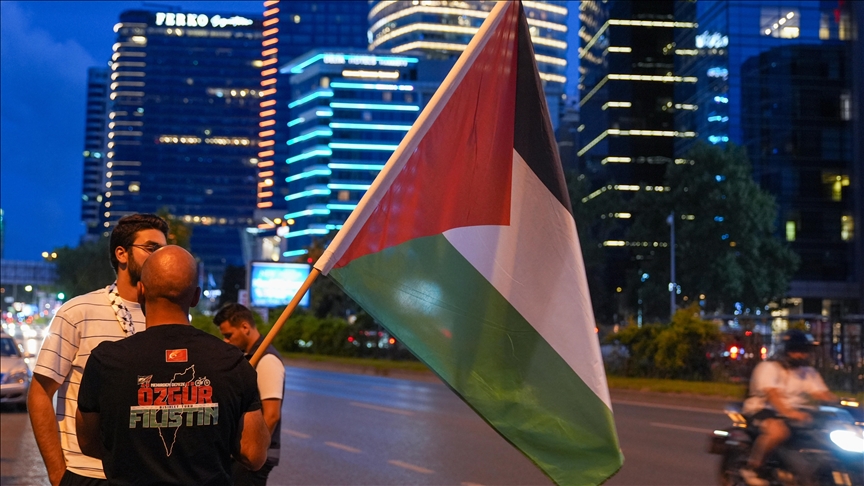 Levent'teki konsolosluk binası önünde toplanan grup, kaldırımda akşam namazını kıldıktan sonra sloganlarla Filistin'e desteklerini iletti.