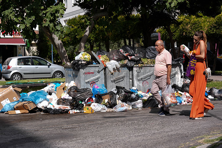 İzmir'in Çiğli ilçesinde belediye çalışanlarının iş yavaşlatması nedeniyle toplanmayan çöpler nedeniyle koku ve kirlilik oluştu.
