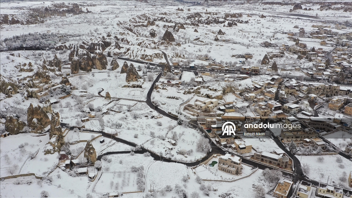 Kar yağışıyla birlikte Kapadokya'nın kış dokusu dronla görüntülendi.