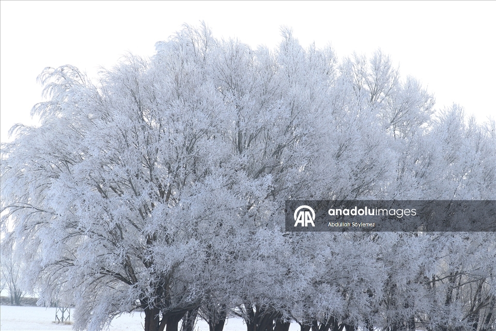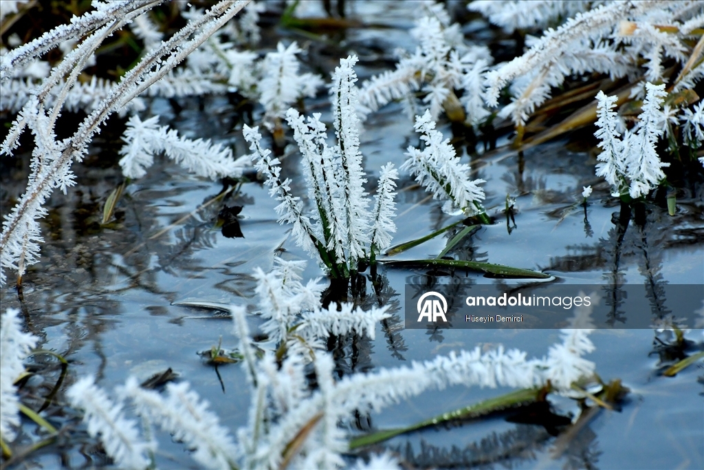 Soğuk hava nedeniyle bitki ve ağaçlarda kırağı oluştu.