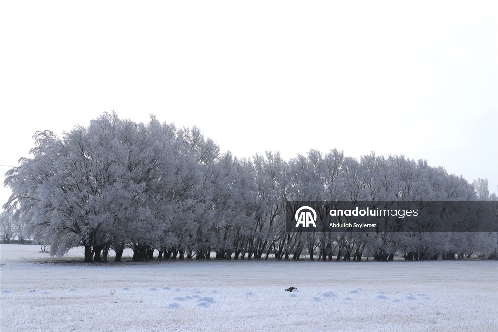 Gece hava sıcaklığının sıfırın altında 8 dereceye düştüğü Sarıkamış ilçesinde de araçların camları ile bitkiler kırağıyla kaplandı.