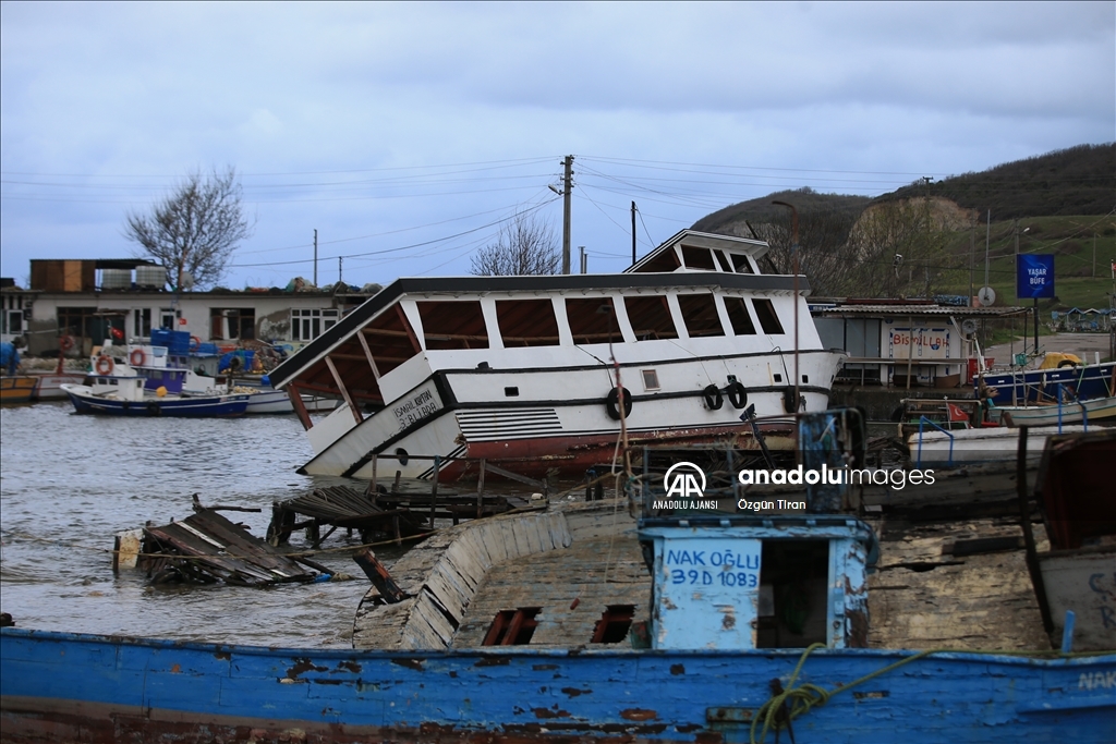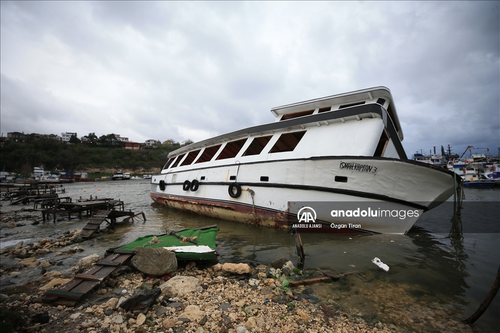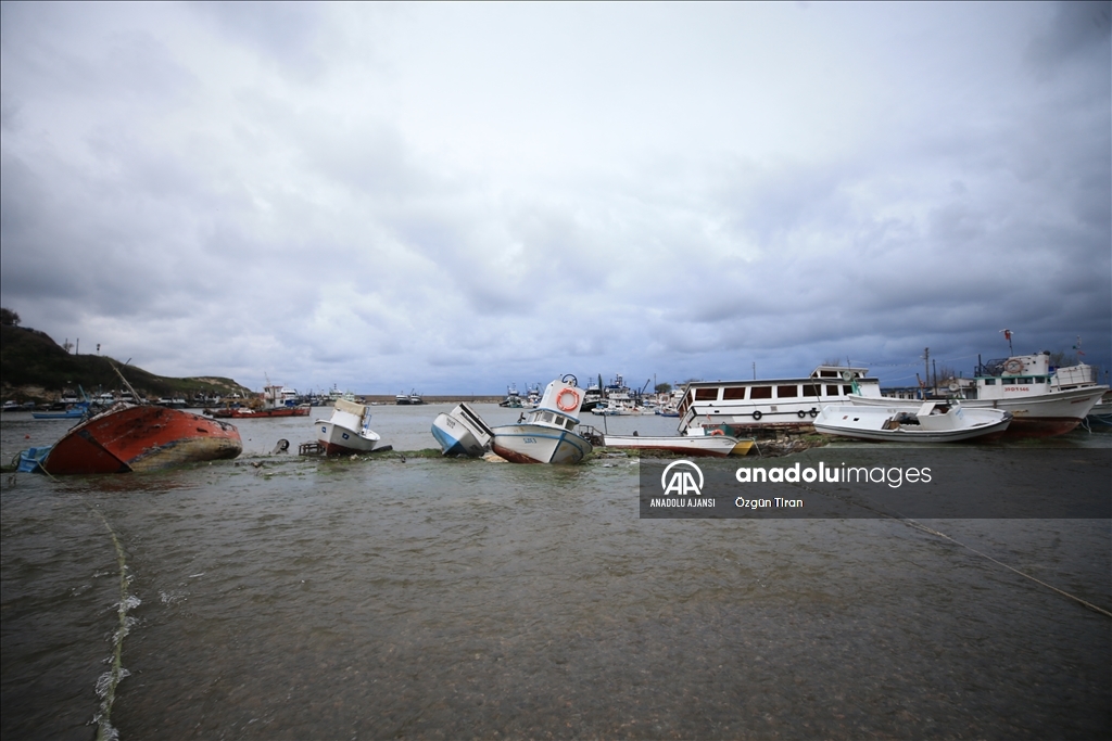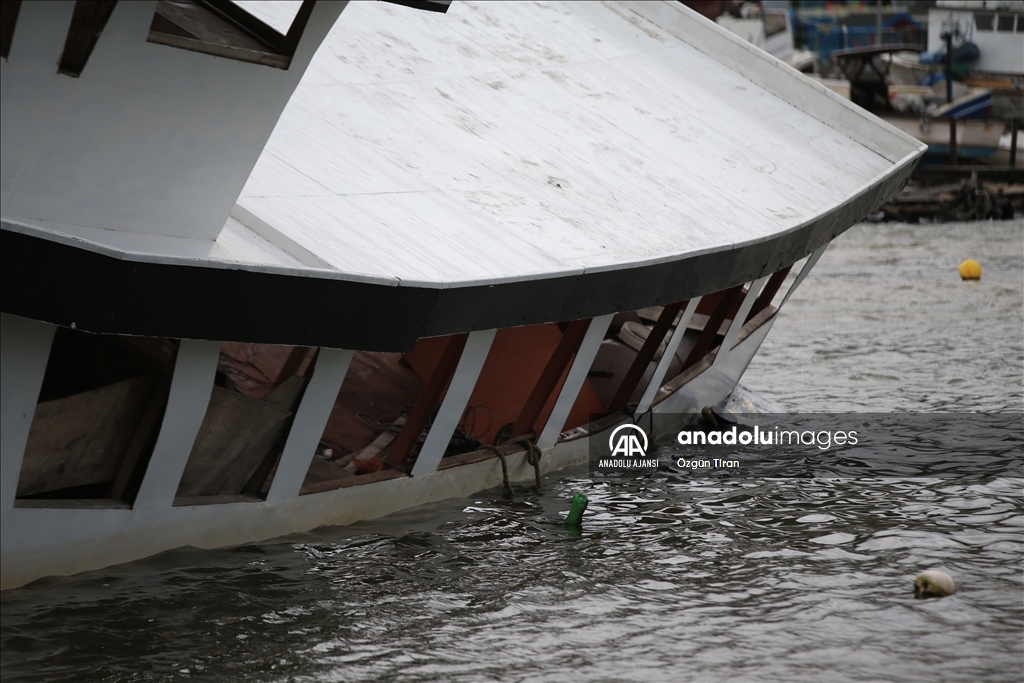 Taşkın nedeniyle limandaki çok sayıda tekne yan yattı, bazı iş yerleri zarar gördü.