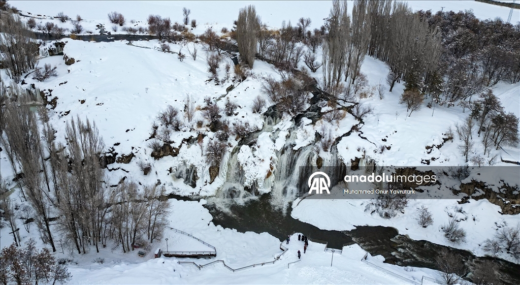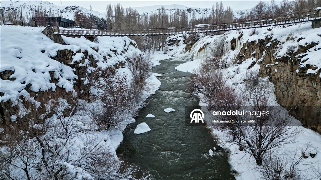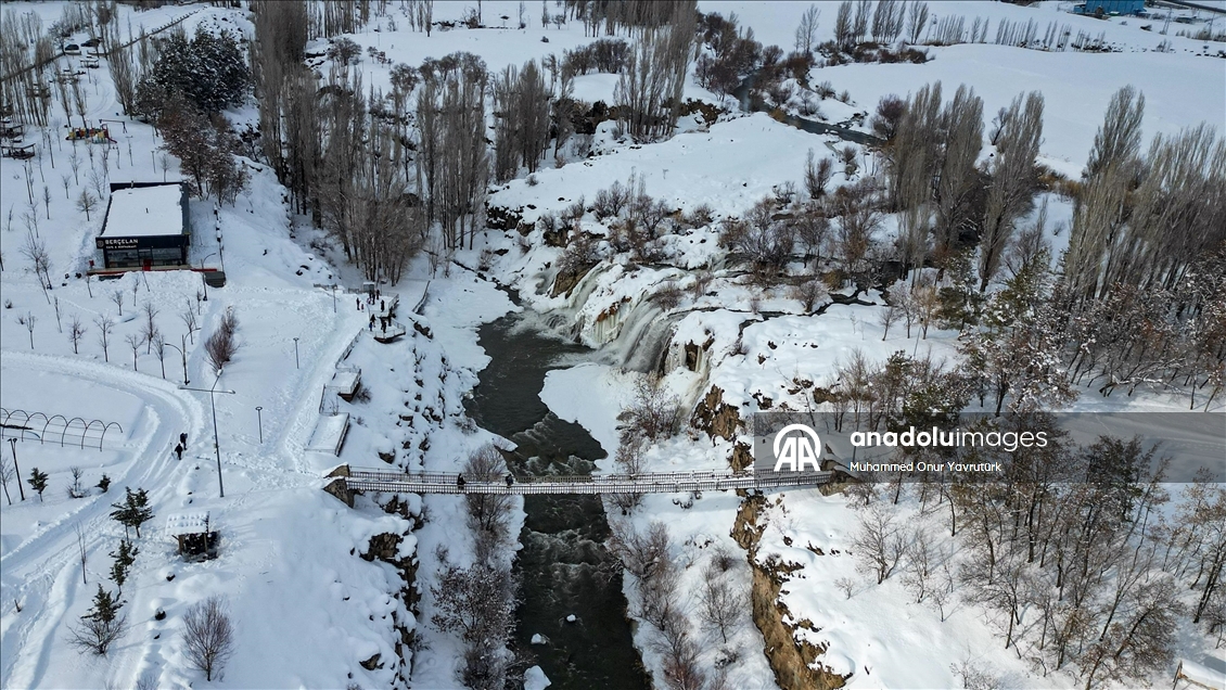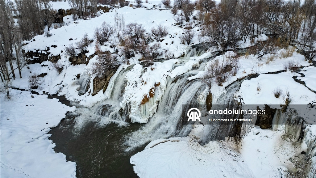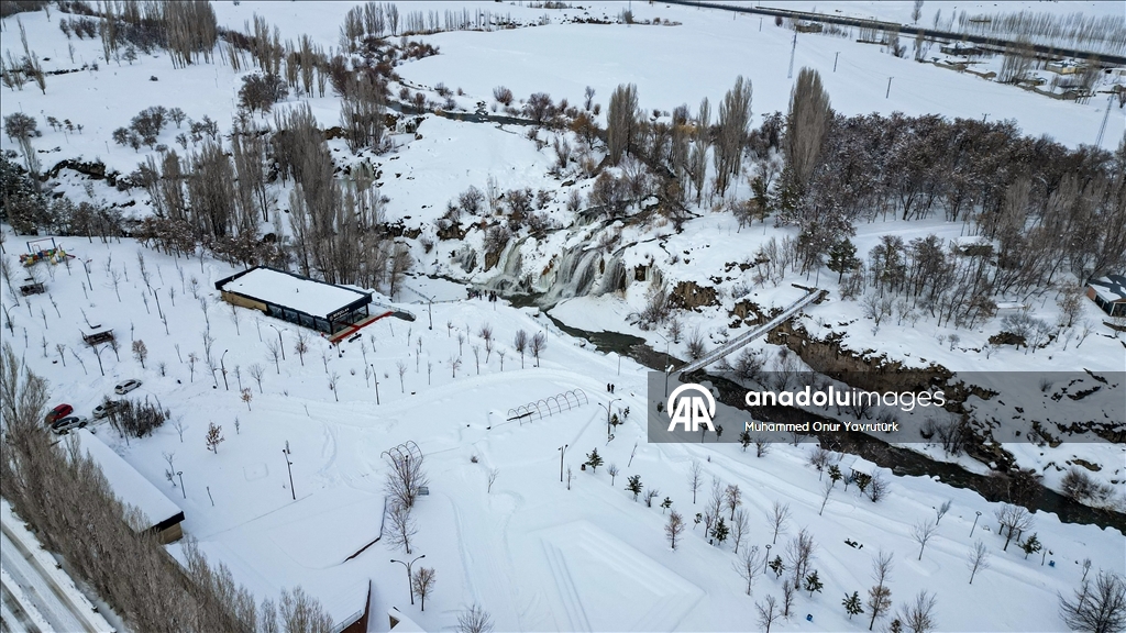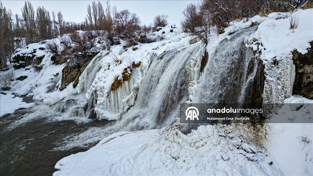 Van'da etkili olan kar yağışının ardından kısmen donan Muradiye Şelalesi'nin çevresi beyaz örtüyle kaplandı.