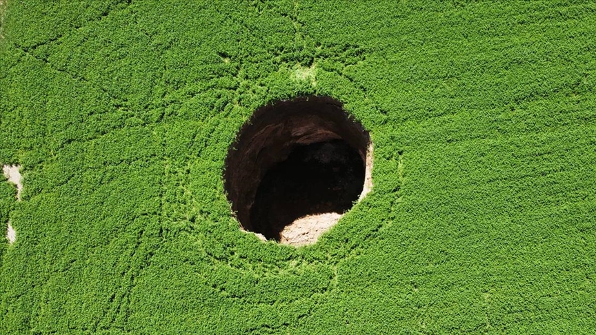 Konya'nın Karapınar ilçesinde 25 kilometre mesafedeki Bece mevkisindeki yonca tarlasında oluşan obruğu fark edenler, tarla sahibi İbrahim Karacan'a haber verdi.