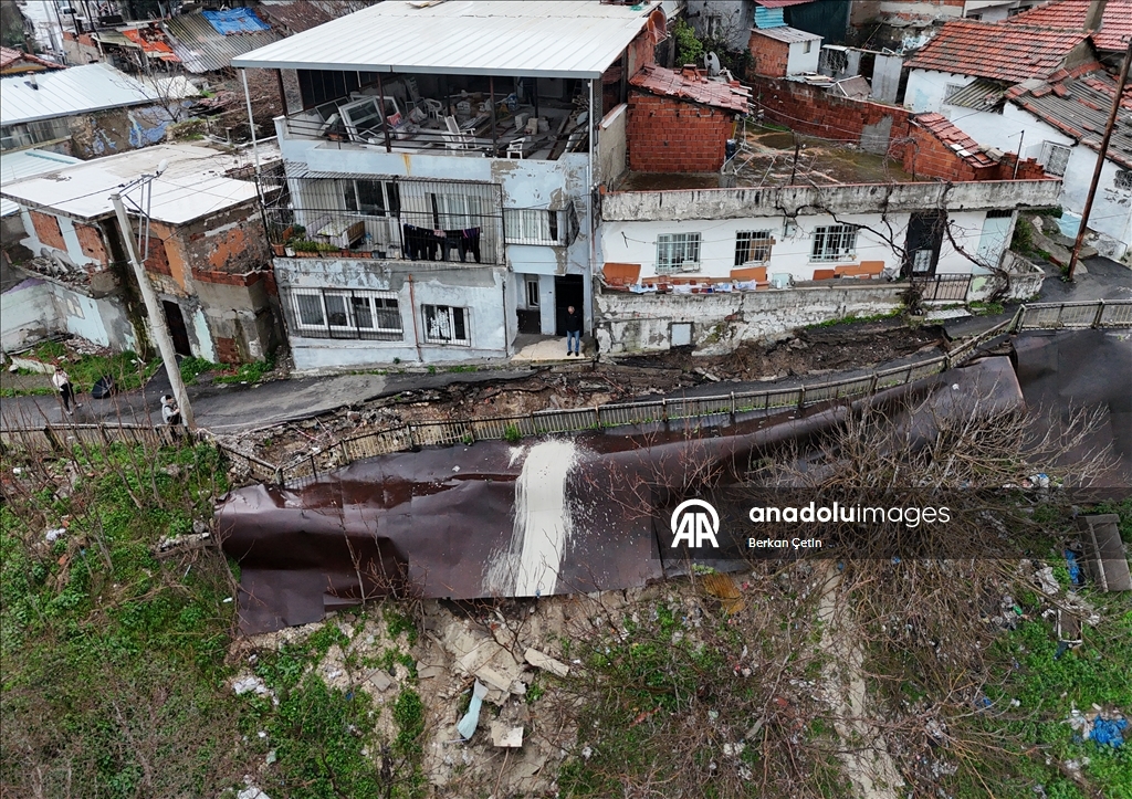 Konak ilçesi Ferahlı Mahallesi 3505 Sokak'ta ise yolda sağanak nedeniyle çökme meydana geldi. Çökme nedeniyle yol ulaşıma kapandı.