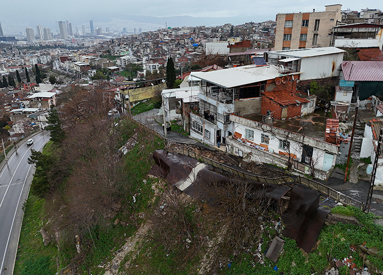 Konak ilçesi Ferahlı Mahallesi 3505 Sokak'ta ise yolda sağanak nedeniyle çökme meydana geldi. Çökme nedeniyle yol ulaşıma kapandı.