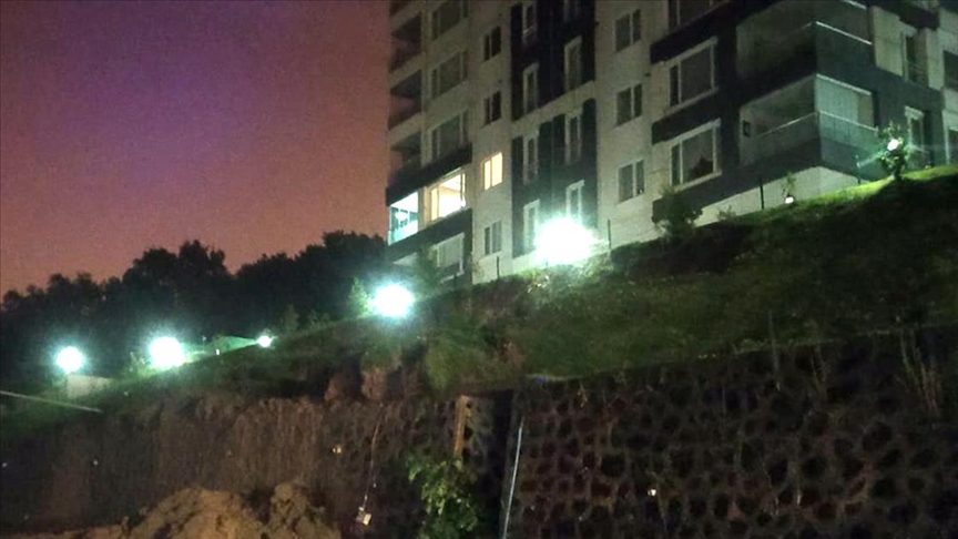 Çevresinde toprak kayması ve istinat duvarındaki hasar nedeniyle bina güvenlik şeridiyle çevrilerek tedbir alındı.