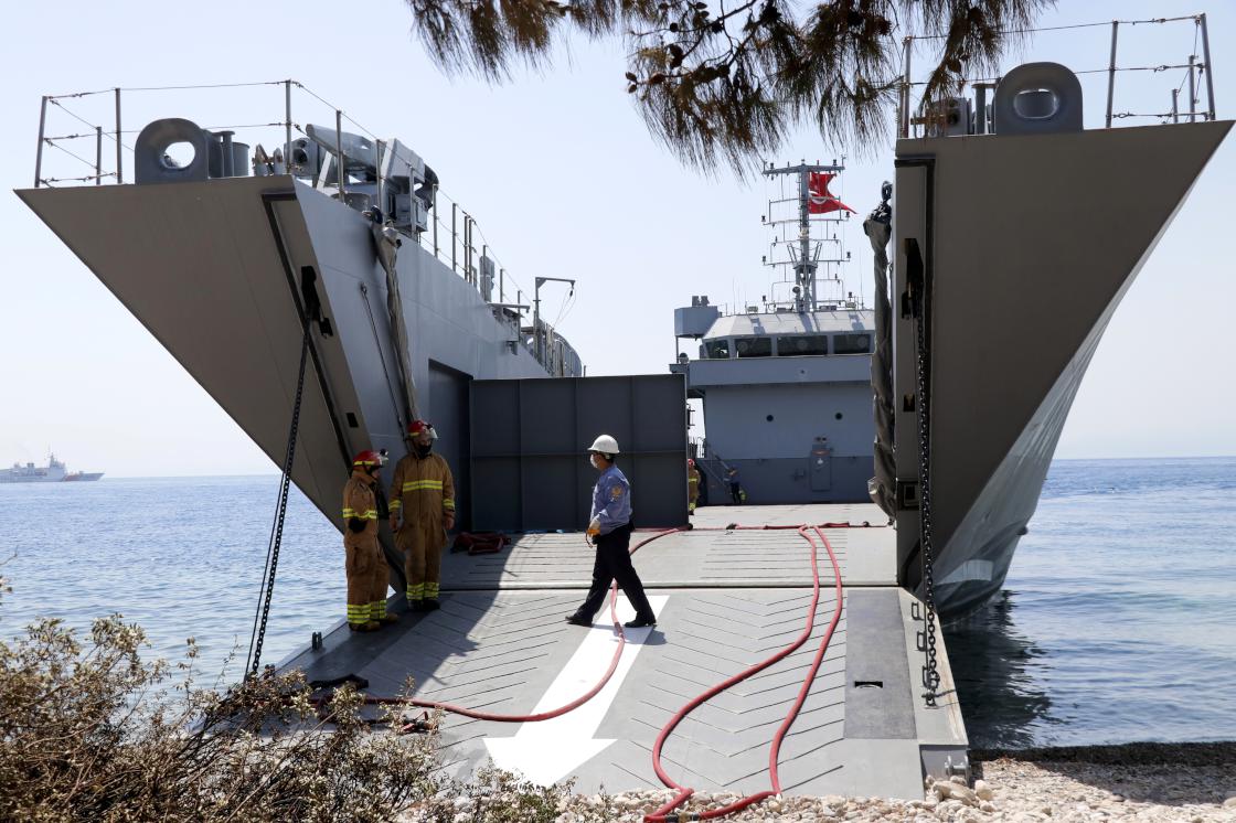Geminin kıyıya yanaşmasıyla personel hortumlarla sahile indi. Çıkarma gemisi personeli kıyıdaki alevlere müdahale etti.