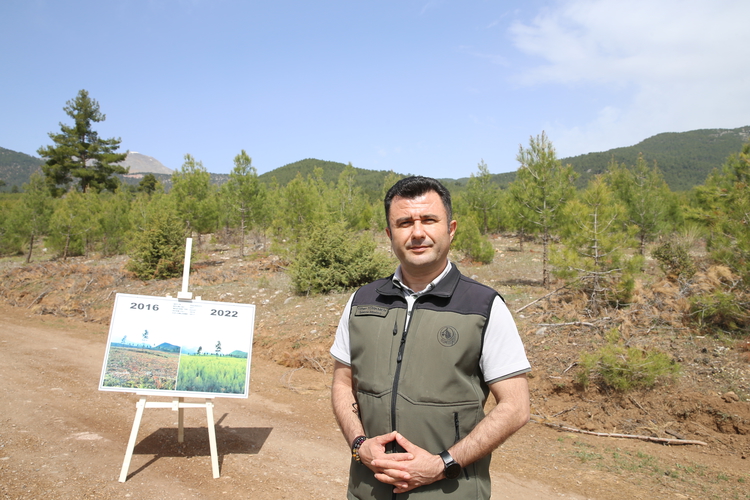 "Arkamızda görülen saha 2016 yılında gençleştirme çalışması kapsamında çalışılmış 2017 yılında çimlenme sağlanmış, yaklaşık 7 yıllık fidanların bulunduğu bir alandır. Denizli Orman Bölge Müdürlüğü ve Acıpayam Orman İşletme Müdürlüğü bünyesinde buna benzer gençleştirme alanlarımız bol miktarda bulunmaktadır.
