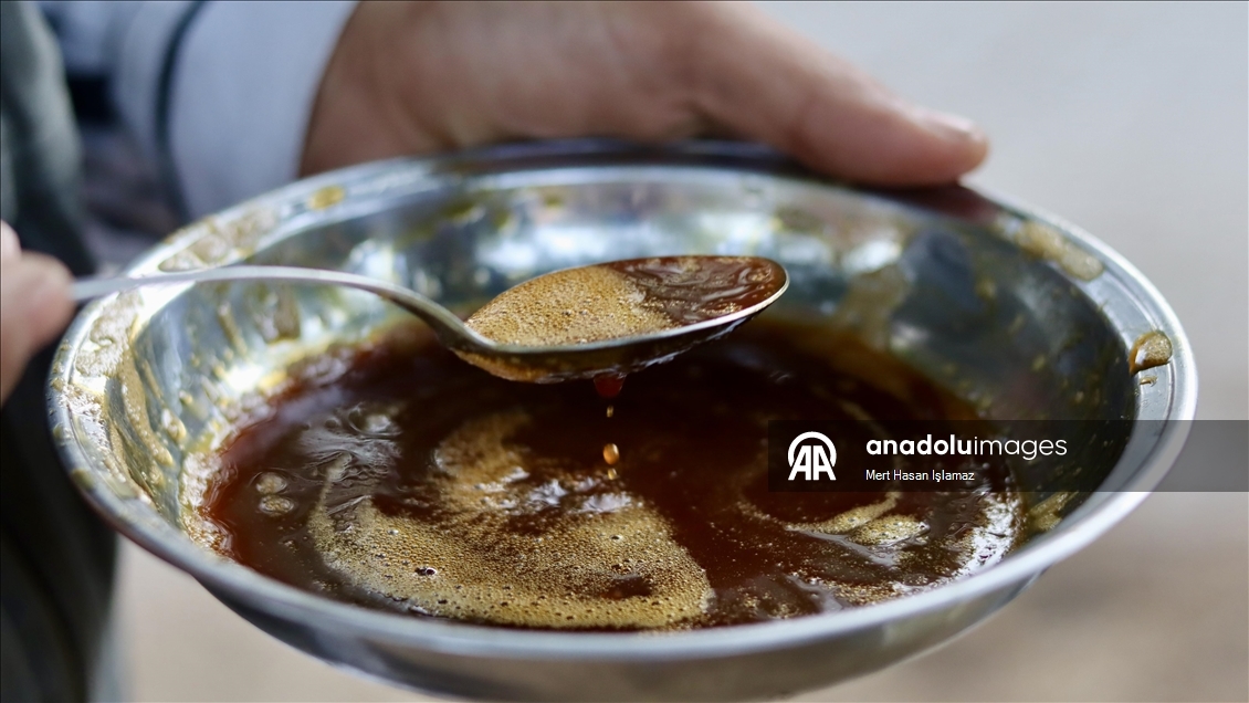 Köy muhtarı Ali Bali, AA muhabirine, geleneksel yöntemle pekmez üretiminin uzun yıllardır devam ettiğini söyledi.
