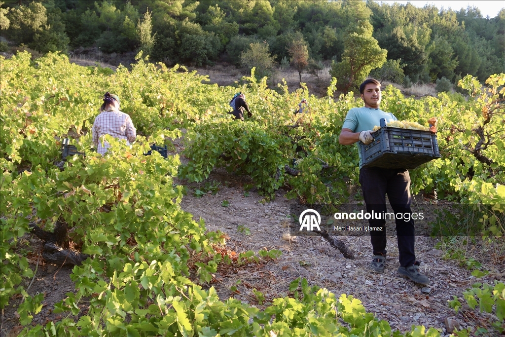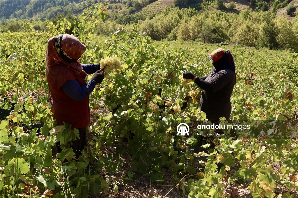Osmaniye'nin Bahçe ilçesinde üzümlerini hasat eden çiftçiler, geleneksel yöntemle pekmez hazırlıyor.