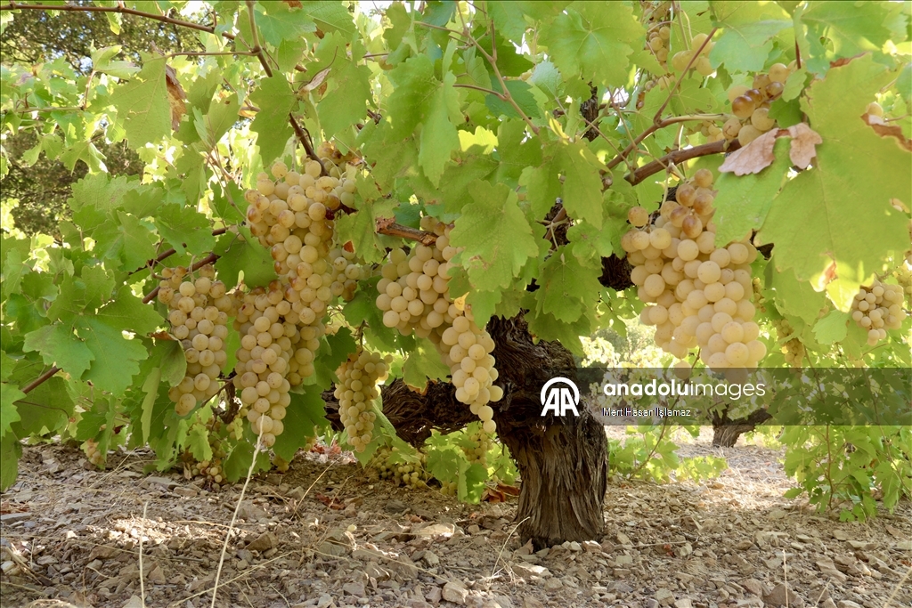 İlçeye bağlı 1100 rakımlı Kaman köyünde çiftçiler, bağ bozumunun ardından üzümlerini taştan oyulmuş havuzlarda topluyor.
