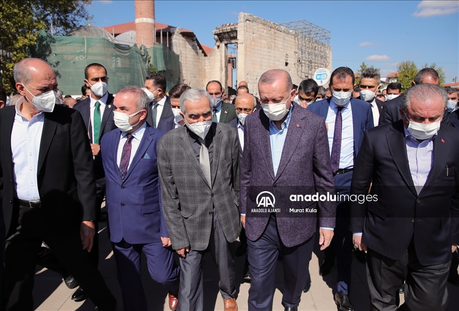Öğle namazı öncesi camide düzenlenen programda Cumhurbaşkanı Erdoğan, Kuran-ı Kerim okudu, Diyanet İşleri Başkanı Erbaş dua etti.