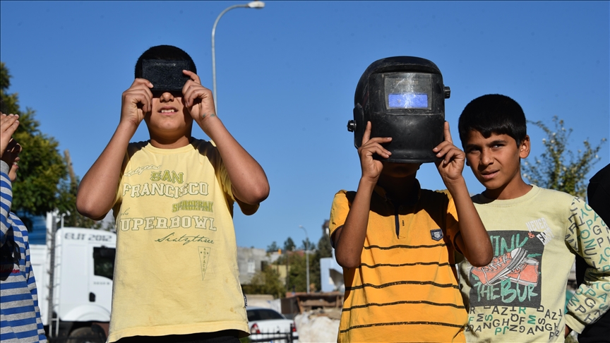 Kaynak yaparken kullandığı maskeyi alan Yılmaz, güneş tutulmasını parktaki çocuklar ve kardeşleriyle birlikte izledi.