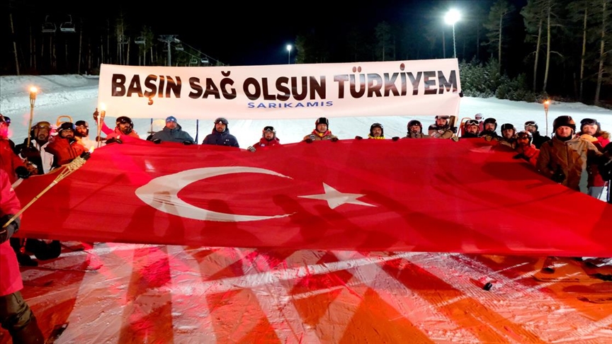 Sarıkamış Kayak Merkezi’nin birinci etap pistinde bir araya gelen kayak eğitmenleri, ellerinde meşalelerle yaklaşık 500 metre kayak yaptıktan sonra şehitler için dua etti.