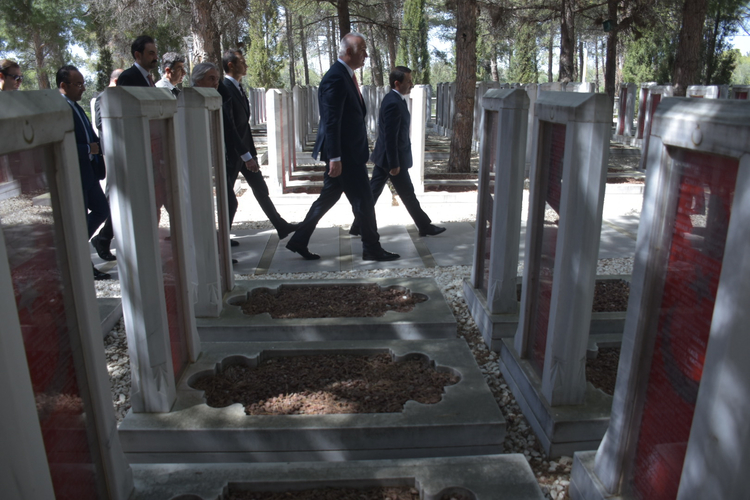 Bakan Mehmet Nuri Ersoy, abidede bulunan temsili şehit mezarlarına karanfil bırakarak, şehitlik anı defterini imzaladı ve dua etti.