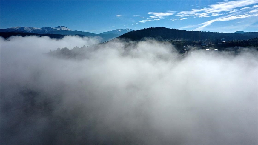 Dağın eteklerini kaplayan sis tabakası, drone ile görüntülendi. Sis sırasında ağaçların dallarında oluşan kırağı da güzel görüntüler oluşturdu.