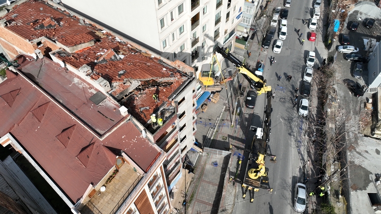 Binanın çatısına vinç yardımıyla iş makinesi yerleştirilmesinin ardından kontrollü yıkıma başlandı.