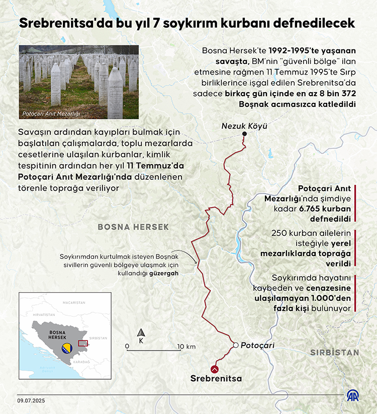 Bosna Hersek'in doğusundaki Srebrenitsa'da 1995'te Sırplar tarafından yapılan soykırımda öldürülen ve kimlikleri tespit edilen soykırım kurbanlarından 7'si daha bugün düzenlenecek cenaze töreninin ardından toprağa verilecek.