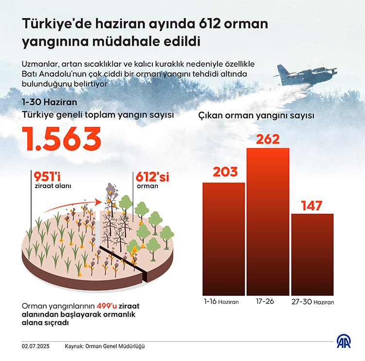 Orman Genel Müdürlüğü verilerine göre, 1-30 Haziran'da 612'si orman, 951'i zirai alan olmak üzere 1563 yangın çıktı. Bu orman yangınlarının 499'u tarım alanlarından başlayarak ormanlara sıçradı.