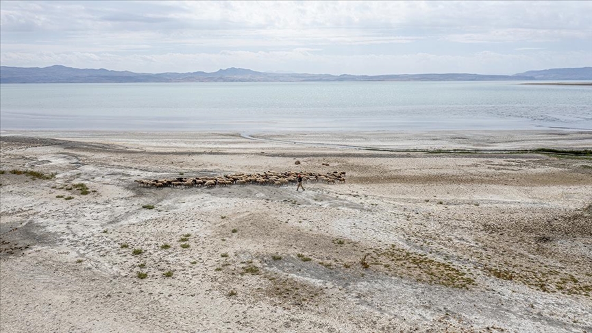 Yağışların azalması ve aşırı buharlaşma dolayısıyla önemli miktarda su kaybının yaşandığı gölün sığ noktalarındaki çekilme yüzlerce metreyi buluyor.