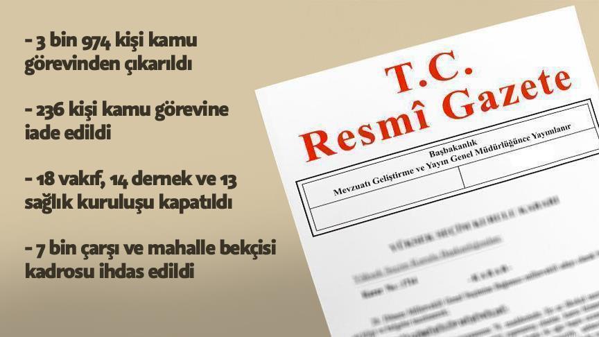689 Sayılı KHK ile ile toplam 3 bin 974 kişi kamu görevinden çıkartıldı, 236 kişi görevine iade edildi.