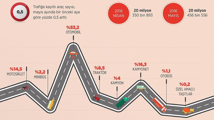 Buna göre, mayıs sonu itibarıyla trafiğe kayıtlı toplam 20 milyon 456 bin 556 taşıtın yüzde 53,2’sini otomobil, yüzde 16,3’ünü kamyonet, yüzde 14,5'ini motosiklet, yüzde 8,5’ini traktör, yüzde 4’ünü kamyon, yüzde 2,2’sini minibüs, yüzde 1,1’ini otobüs, yüzde 0,2’sini ise özel amaçlı taşıtlar oluşturdu.