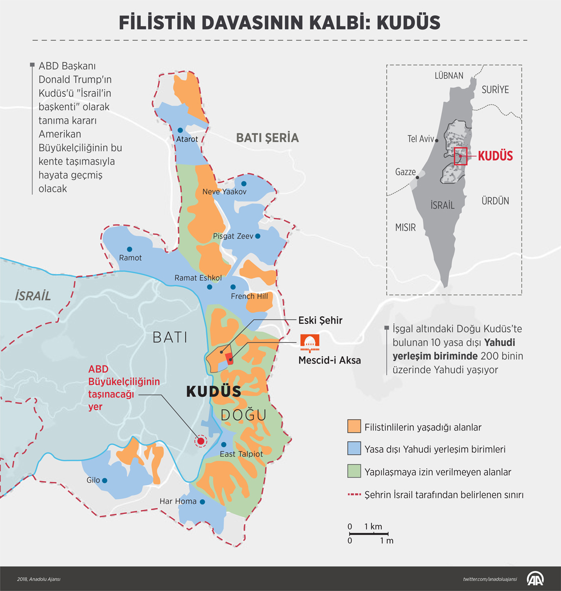 ABD Başkanı Donald Trump'ın Kudüs'ü "İsrail'in başkenti" olarak tanıma kararı Amerikan Büyükelçiliğinin bu kente taşımasıyla hayata geçmiş olacak. İşgal altındaki Doğu Kudüs’te bulunan 10 yasa dışı Yahudi yerleşim biriminde 200 binin üzerinde Yahudi yaşıyor.