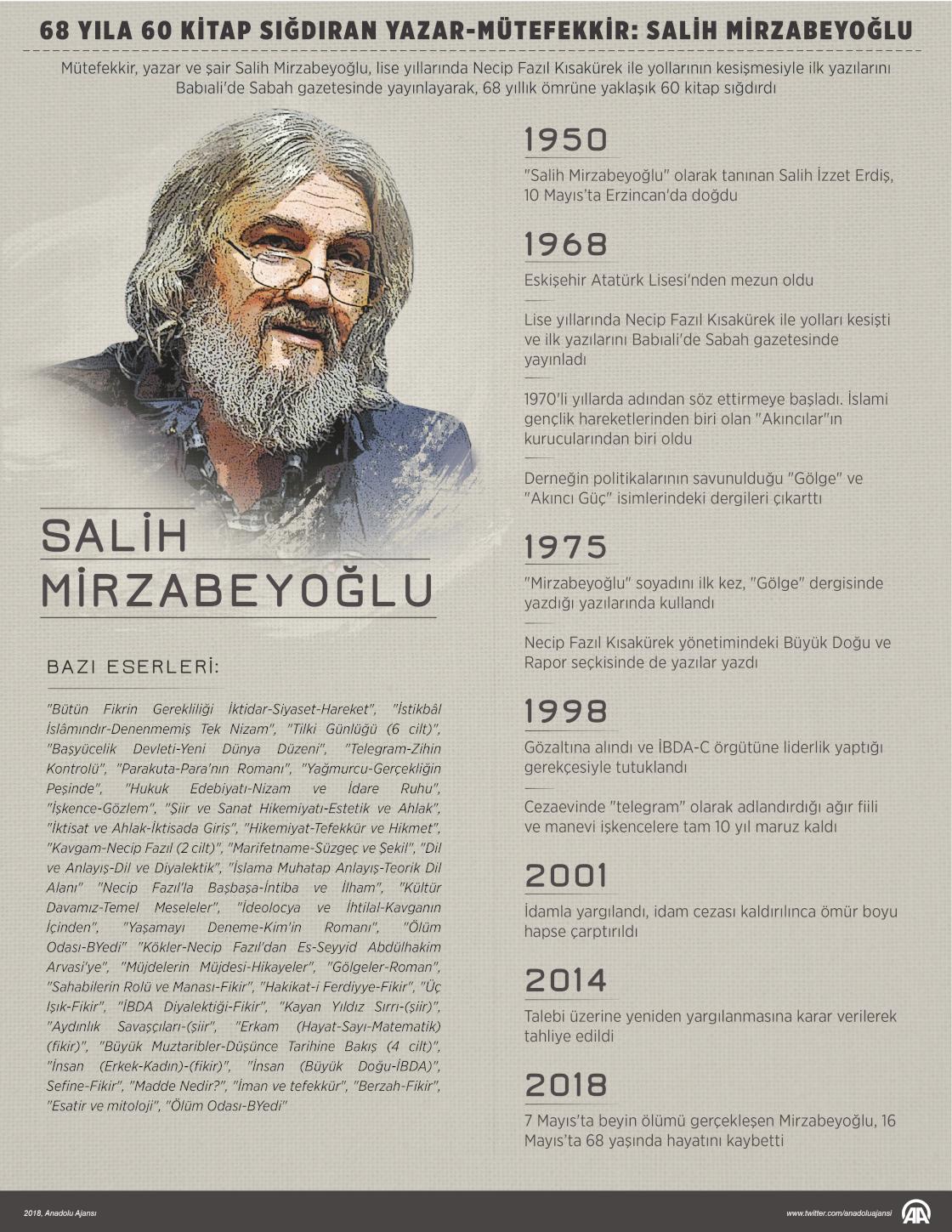 Kamuoyunda "Salih Mirzabeyoğlu" olarak tanınan Salih İzzet Erdiş, 10 Mayıs 1950'de Erzincan'da doğdu. Lise yıllarında Necip Fazıl Kısakürek ile yolları kesişen ve ilk yazılarını Babıali'de Sabah gazetesinde yayınlayan Mirzabeyoğlu, 68 yıllık ömrüne yaklaşık 60 kitap sığdırdı. ( Gözde Gültekinler - Anadolu Ajansı )16 Mayıs 2018•Güncelleme: 16 Mayıs 2018