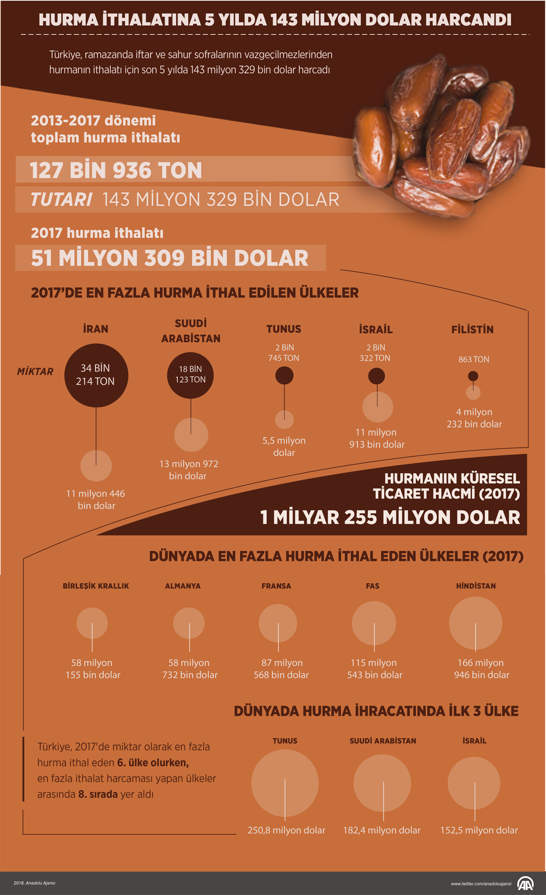 Türkiye, 2013-2017 döneminde 143 milyon 329 bin dolarlık hurma ithal etti. Geçen yıl sofralarda 13 farklı ülkeden hurma yer alırken, 51 milyon 309 bin dolarlık ithalatın yüzde 91,7’si Suudi Arabistan, İsrail, İran, Tunus ve Filistin'den karşılandı.