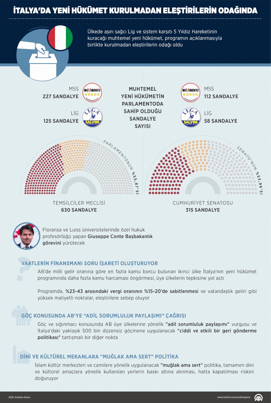 Ülkede aşırı sağcı Lig ve sistem karşıtı 5 Yıldız Hareketinin kuracağı muhtemel yeni hükümet, programın açıklanmasıyla kurulmadan eleştirilerin odağı oldu. Lig ve 5 Yıldız Hareketinin açıkladığı hükümet programındaki kamu harcamalarının artırılması, kemer sıkma politikalarına son verilmesi, düzensiz göçe karşı sert politika, İslam kültür merkezleri ve camilere yönelik baskıcı politikalar özellikle AB içinde tedirginlik yaratıyor. ( Yasin Demirci - Anadolu Ajansı )23 Mayıs 2018•Güncelleme: 23 Mayıs 2018