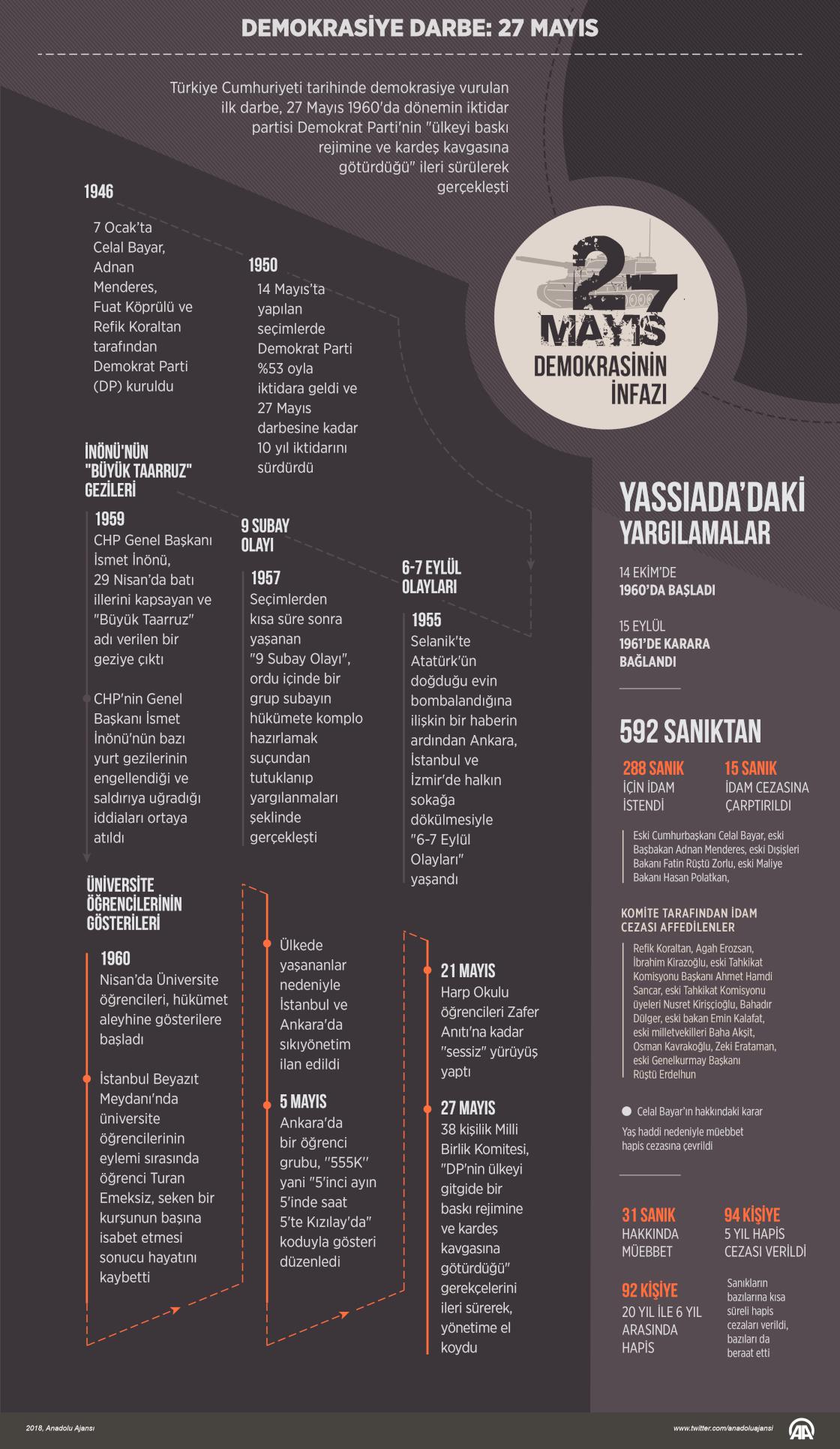Türkiye Cumhuriyeti tarihinde demokrasiye vurulan ilk darbe, 27 Mayıs 1960'da dönemin iktidar partisi Demokrat Parti'nin (DP) "ülkeyi baskı rejimine ve kardeş kavgasına götürdüğü" ileri sürülerek gerçekleşti. Türk Silahlı Kuvvetleri içerisindeki bazı general ve subayların oluşturduğu 38 kişilik Milli Birlik Komitesi, 27 Mayıs sabaha karşı yönetime el koydu. Darbe sonrası Yassıada'daki yargılamalar 15 Eylül 1961'de karara bağlandı, 15 sanık idam cezasına çarptırıldı. Bu hükmün ardından darbe dönemi Başbakanı Adnan Menderes, Dışişleri Bakanı Fatin Rüştü Zorlu ve Maliye Bakanı Hasan Polatkan, asılarak idam edildi. ( Ahmet Burak Özkan - Anadolu Ajansı )24 Mayıs 2018•Güncelleme: 24 Mayıs 2018