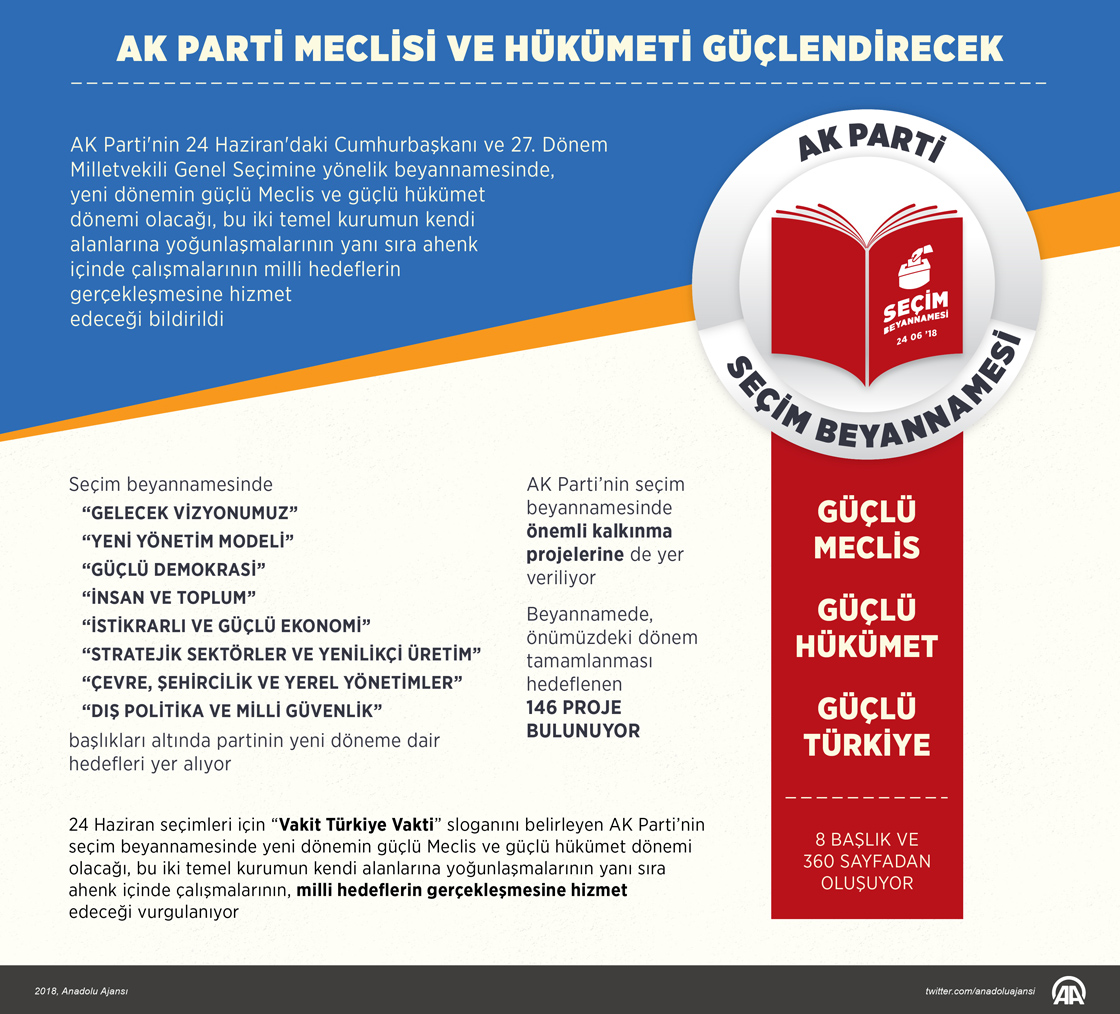 AK Parti'nin 24 Haziran'daki Cumhurbaşkanı ve 27. Dönem Milletvekili Genel Seçimine yönelik beyannamesinde, yeni dönemin güçlü Meclis ve güçlü hükümet dönemi olacağı, bu iki temel kurumun kendi alanlarına yoğunlaşmalarının yanı sıra ahenk içinde çalışmalarının milli hedeflerin gerçekleşmesine hizmet edeceği bildirildi. ( Anadolu Ajansı - Murat Usubaliev)24 Mayıs 2018•Güncelleme: 24 Mayıs 2018