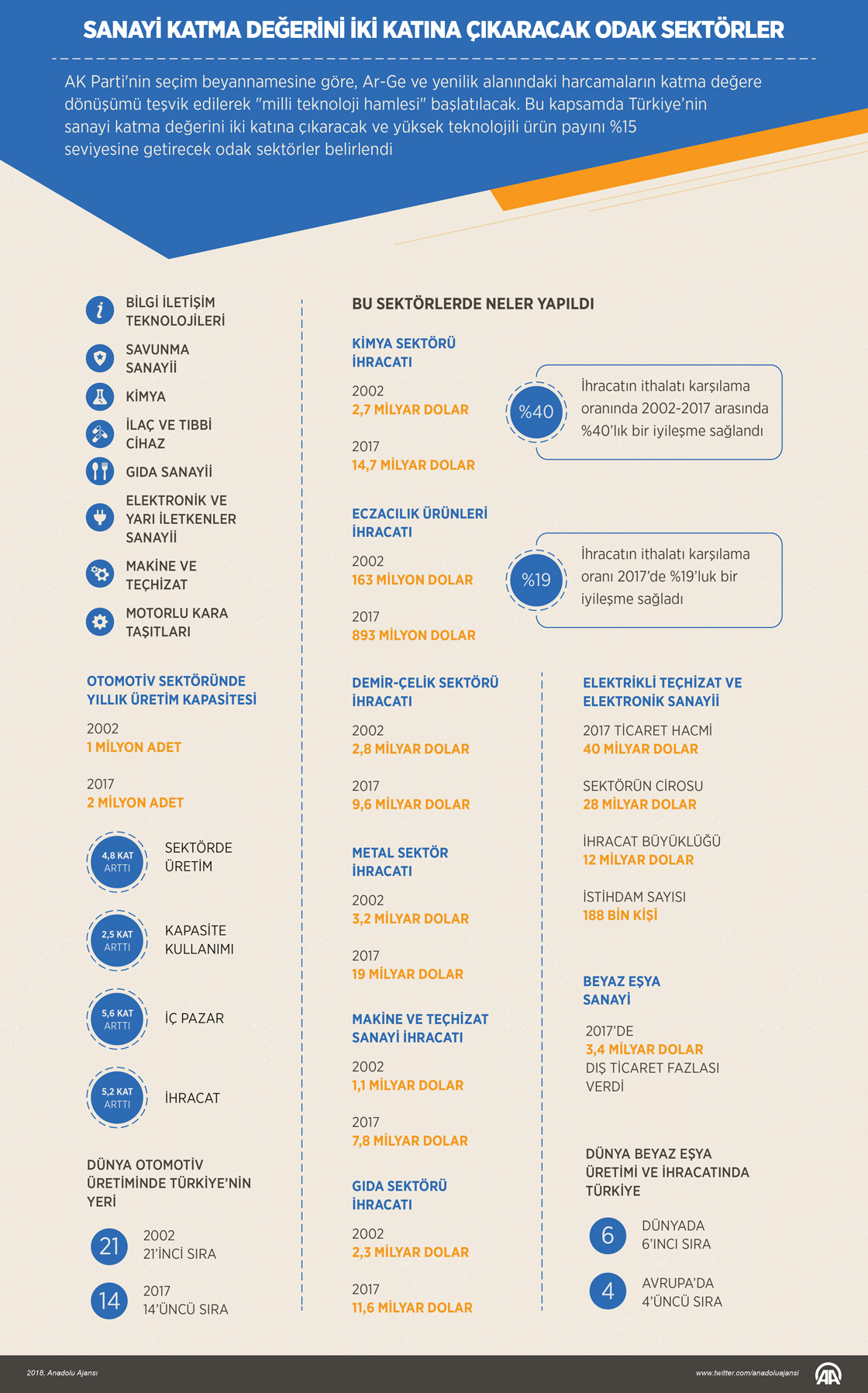 AK Parti'nin "24 Haziran Cumhurbaşkanlığı Seçimleri ve Genel Seçimler Seçim Beyannamesi"nde, "Stratejik Sektörler ve Yenilikçi Üretim" başlığı altında dijitalleşmeden imalat sanayisine, bilim ve teknolojiden Ar-Ge'ye kadar birçok alanda yapılan çalışmalar yer aldı. ( Ahmet Burak Özkan - Anadolu Ajansı )24 Mayıs 2018•Güncelleme: 24 Mayıs 2018