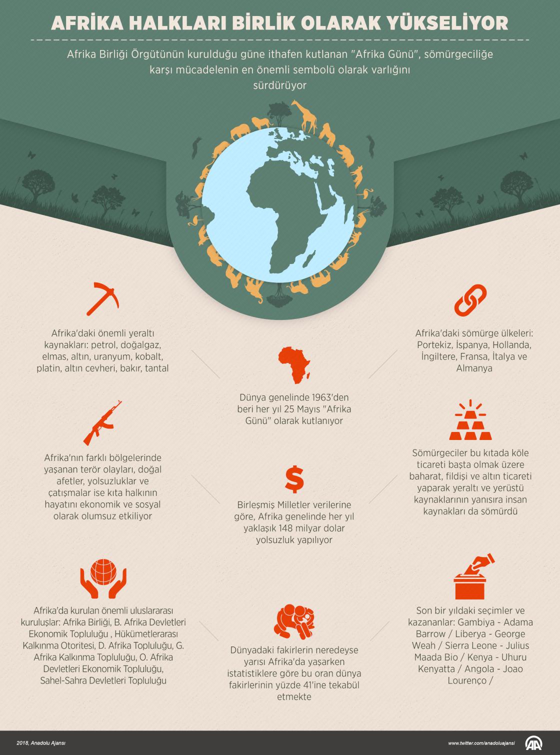 Afrika Birliği Örgütünün kurulduğu güne ithafen kutlanan "Afrika Günü", sömürgeciliğe karşı mücadelenin en önemli sembolü olarak varlığını sürdürüyor. Dünya genelinde 1963'den bu yana her yıl 25 Mayıs, "Afrika Günü" olarak kutlanırken bağımsızlığını kazanan Afrika ülkelerinin kurduğu yeni birlik ve oluşumlar, kıtadaki ülkelerin ve halkların, ekonomik ve kültürel sömürüden bir adım daha uzaklaşmasına katkı sağlıyor. ( Muhammed Ali Yiğit - Anadolu Ajansı )25 Mayıs 2018•Güncelleme: 25 Mayıs 2018