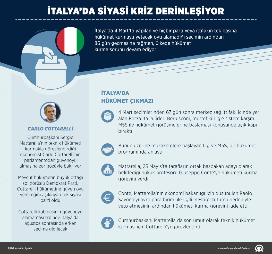 İtalya’da Cumhurbaşkanı Sergio Mattarella’nın teknik hükümeti kurmakla görevlendirdiği ekonomist Carlo Cottarelli’nin parlamentodan güvenoyu almasına zor gözüyle bakılırken ağustosta erken seçime gitme olasılığı ağır basıyor. İtalya’da 4 Mart’ta yapılan ve hiçbir parti veya ittifakın tek başına hükümet kurmaya yetecek oyu alamadığı seçimin ardından 86 gün geçmesine rağmen, ülkede hükümet kurma sorunu devam ediyor.