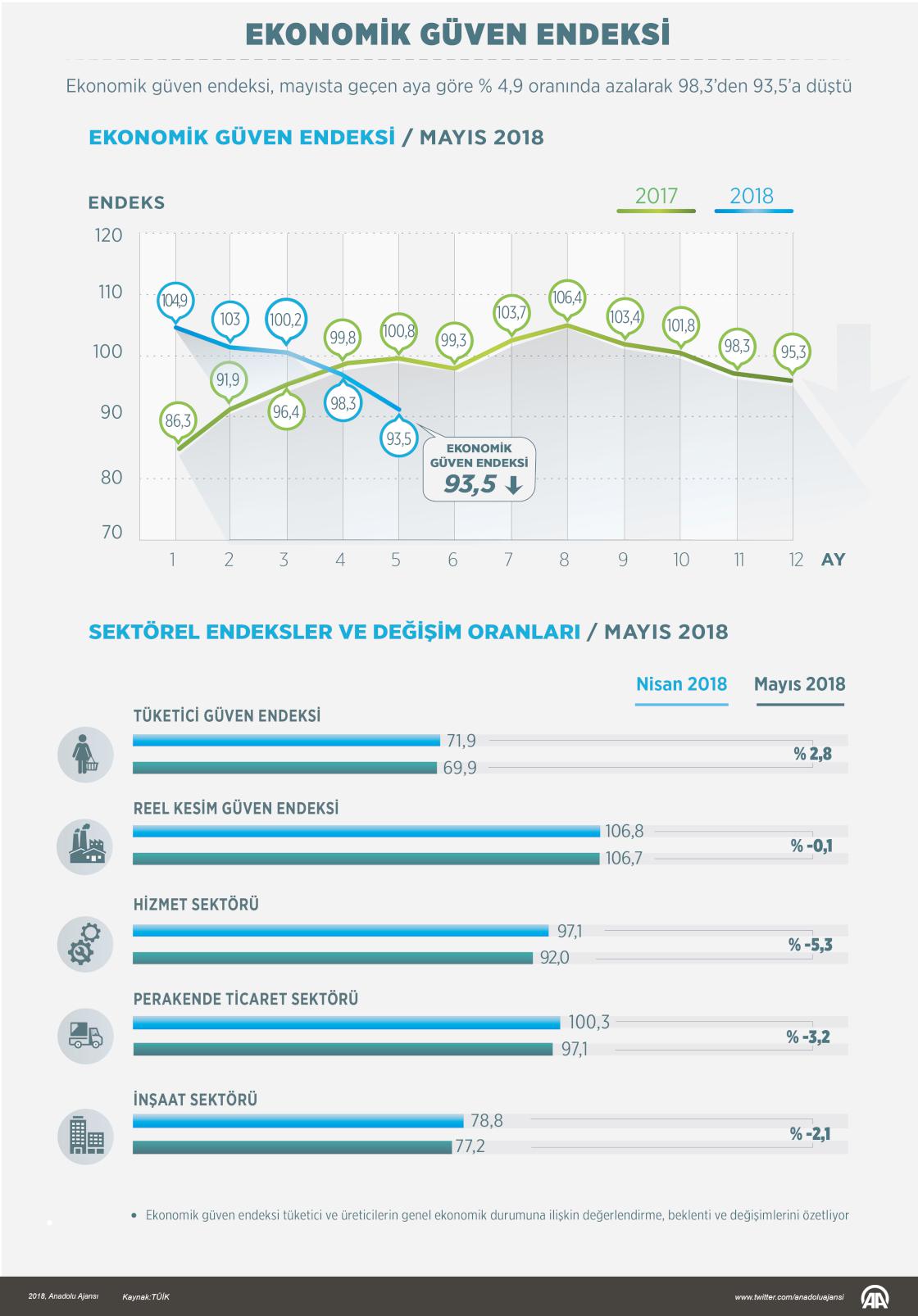 Ekonomik güven endeksi, mayısta geçen aya göre yüzde 4,9 azalarak 98,3'ten 93,5'e düştü ( Gözde Gültekinler - Anadolu Ajansı )