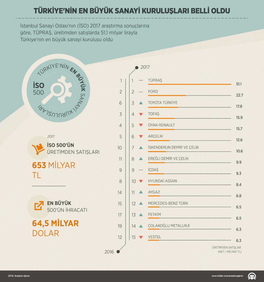İstanbul Sanayi Odası'nın hazırladığı ''Türkiye'nin 500 Büyük Sanayi Kuruluşu 2017 Araştırması''na göre, Türkiye Petrol Rafinerileri AŞ (TÜPRAŞ), üretimden satışlarda 51,1 milyar lirayla Türkiye'nin en büyük sanayi kuruluşu oldu. ( Ahmet Burak Özkan - Anadolu Ajansı )30 Mayıs 2018•Güncelleme: 30 Mayıs 2018
