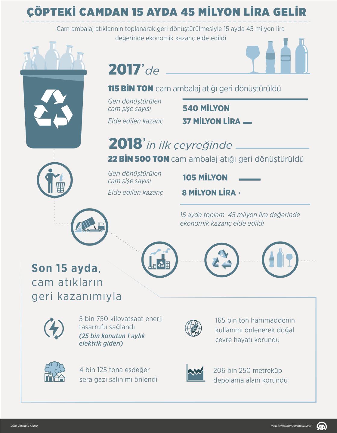 "Geçen yıl geri dönüştürülen 115 bin ton cam ambalaj atığından 37 milyon lira, yılın ilk çeyreğinde ise 8 milyon lira olmak üzere 15 ayda 45 milyon lira değerinde ekonomik kazanç elde edildi" ( Gözde Gültekinler - Anadolu Ajansı )