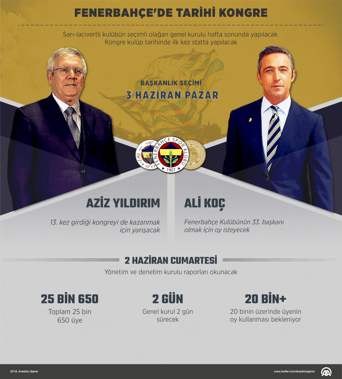 Fenerbahçe Kulübü Seçimli Olağan Genel Kurulu hafta sonunda yapılacak. Ülker Stadı'nda gerçekleştirilecek tarihi kongrede mevcut başkan Aziz Yıldırım ile eski yöneticilerden Ali Koç, başkanlık için yarışacak. Kulüp tarihinde ilk kez statta düzenlenecek kongreye rekor katılım bekleniyor. Genel kurulda, aidatını yatıran 25 bin 650 üye oy kullanabilecek. ( Kemal Delikmen - Anadolu Ajansı )01 Haziran 2018•Güncelleme: 01 Haziran 2018
