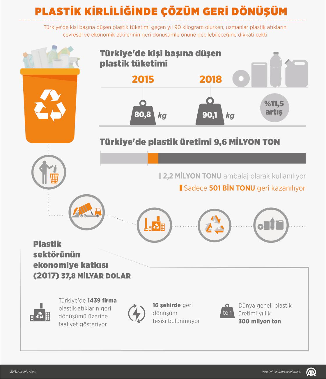 Türkiye'de kişi başına düşen plastik tüketimi son 3 yılda yüzde 11,5 artışla geçen yıl 90,1 kilograma yükselirken, uzmanlar plastik atıkların çevresel ve ekonomik etkilerinin geri dönüşümle önüne geçilebileceğini belirtiyor. Plastik Sanayicileri Derneği (PAGDER) verilerine göre, Türkiye'de 2015'de 80,8 kilogram olan kişi başı plastik tüketimi 3 yılda yüzde 11,5 artarak geçen yıl 90,1 kilograma ulaştı. ( Gözde Gültekinler - Anadolu Ajansı )05 Haziran 2018•Güncelleme: 05 Haziran 2018