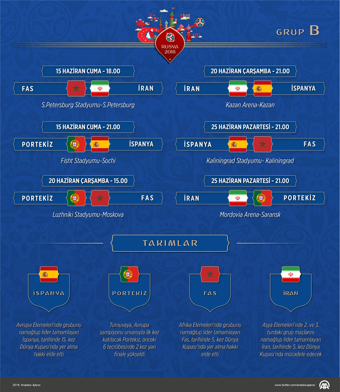 Rusya'nın ev sahipliği yapacağı 21. FIFA Dünya Kupası'nda İspanya, Portekiz, Fas ve İran B Grubu'nda mücadele edecek. Grafik: AA/Kemal Delikmen