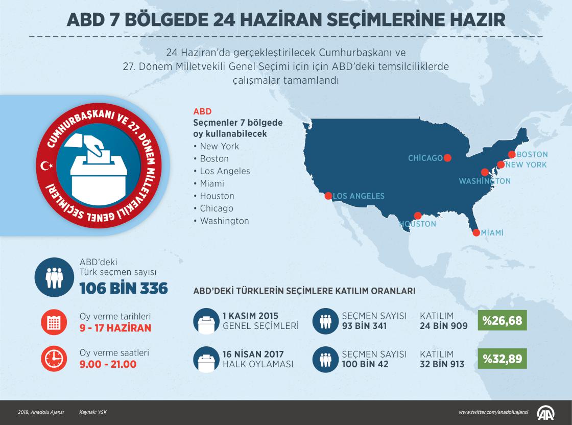 ABD'de yaşayan Türk vatandaşları, 24 Haziran’daki Cumhurbaşkanı ve 27. Dönem Milletvekili Genel Seçimi için 9-17 Haziran'da sandık başına gidecek. ( Yasin Demirci - Anadolu Ajansı )